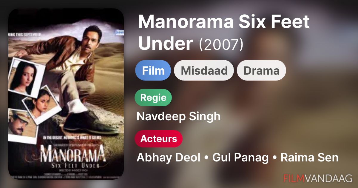 Source: stratrelxto.pages.dev , Manorama Six Feet Under is a 2007 Indian crime thriller film directed and co-written by Navdeep Singh.The film features Abhay Deol, Raima Sen, and Gul Panag in the lead roles Manorama Six Feet Under (2007) UA 09/21/2007 (IN) Thriller, Crime, Mystery, Drama 2h 17m.